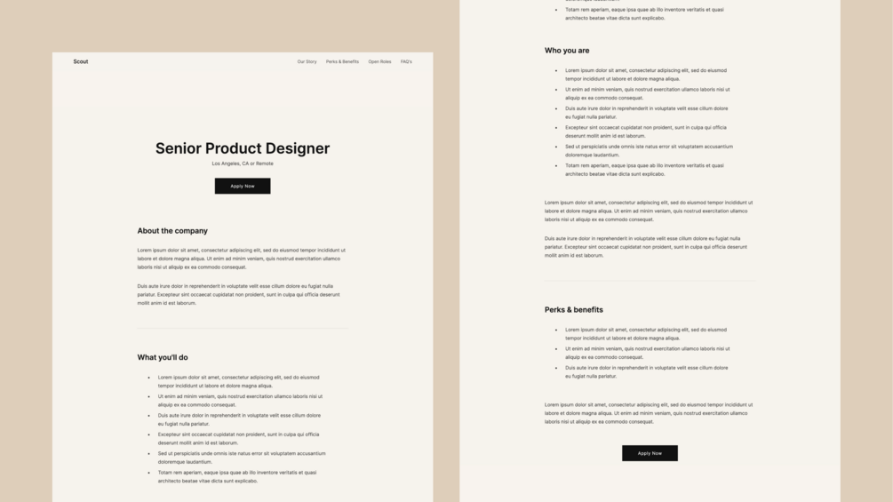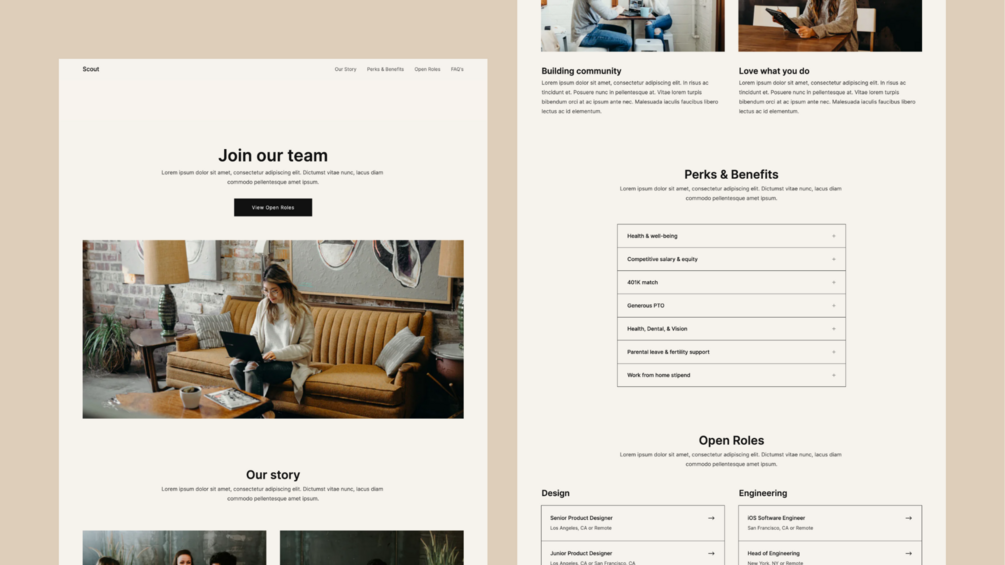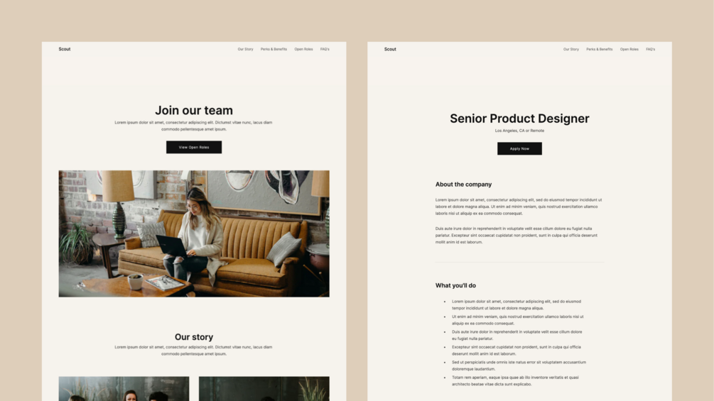 Scout is the perfect template to help you post new job postings, share your companies culture and values, answer frequent questions, and entice job seekers with your benefits.